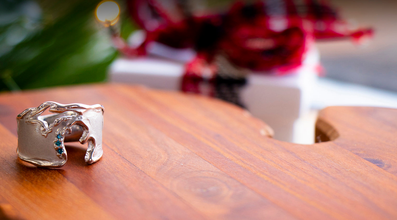 This beautiful upper and lower peninsula blue diamond ring is carved out of a wider melted band.