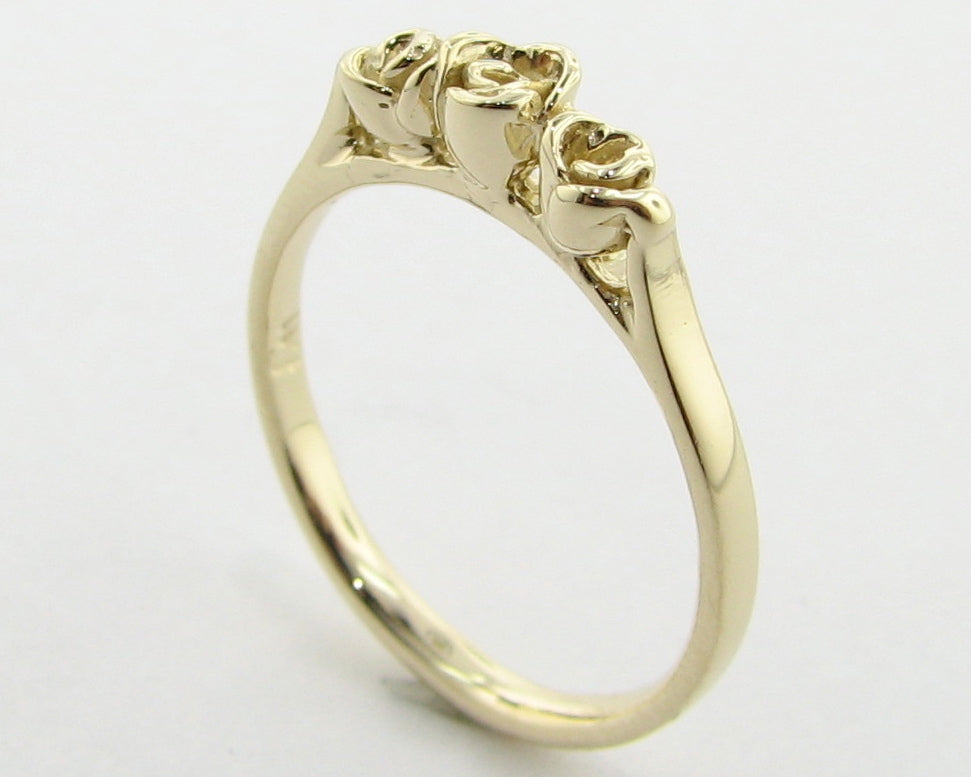 Yellow Gold Band, Three Dainty Roses - This simple sweet band features three tiny rosebuds in a row- central slightly larger, sides facing outward. The cathedral band follows the curve of the finger, then embraces the roses ever so gently, ending in a taper. The ring measures appx 4 at the very widest point, the main part being just over 2mm wide. The inside of the band is beveled for comfort- this ring is built to wear daily. Looks lovely by itself or with dainty bands stacked on either side. 14K Yellow Gold.