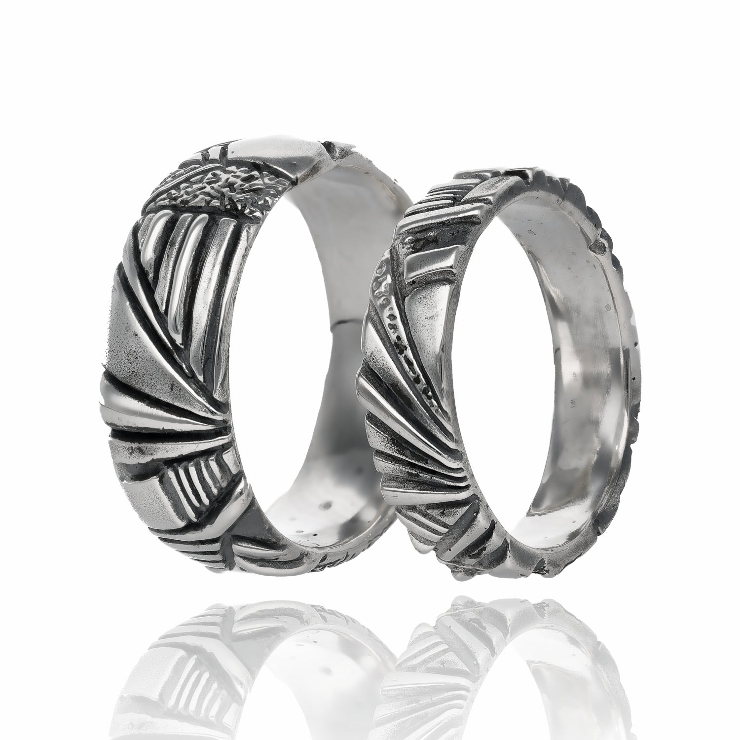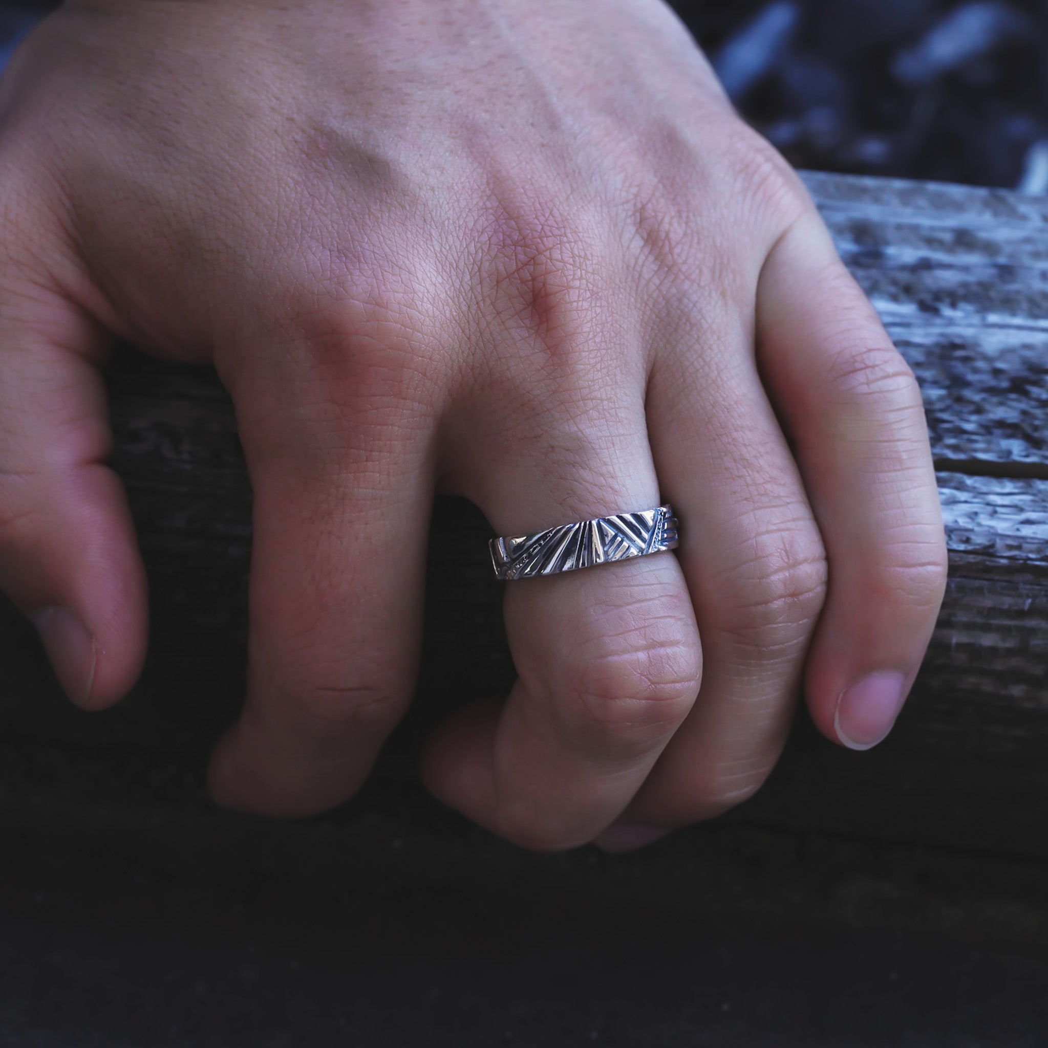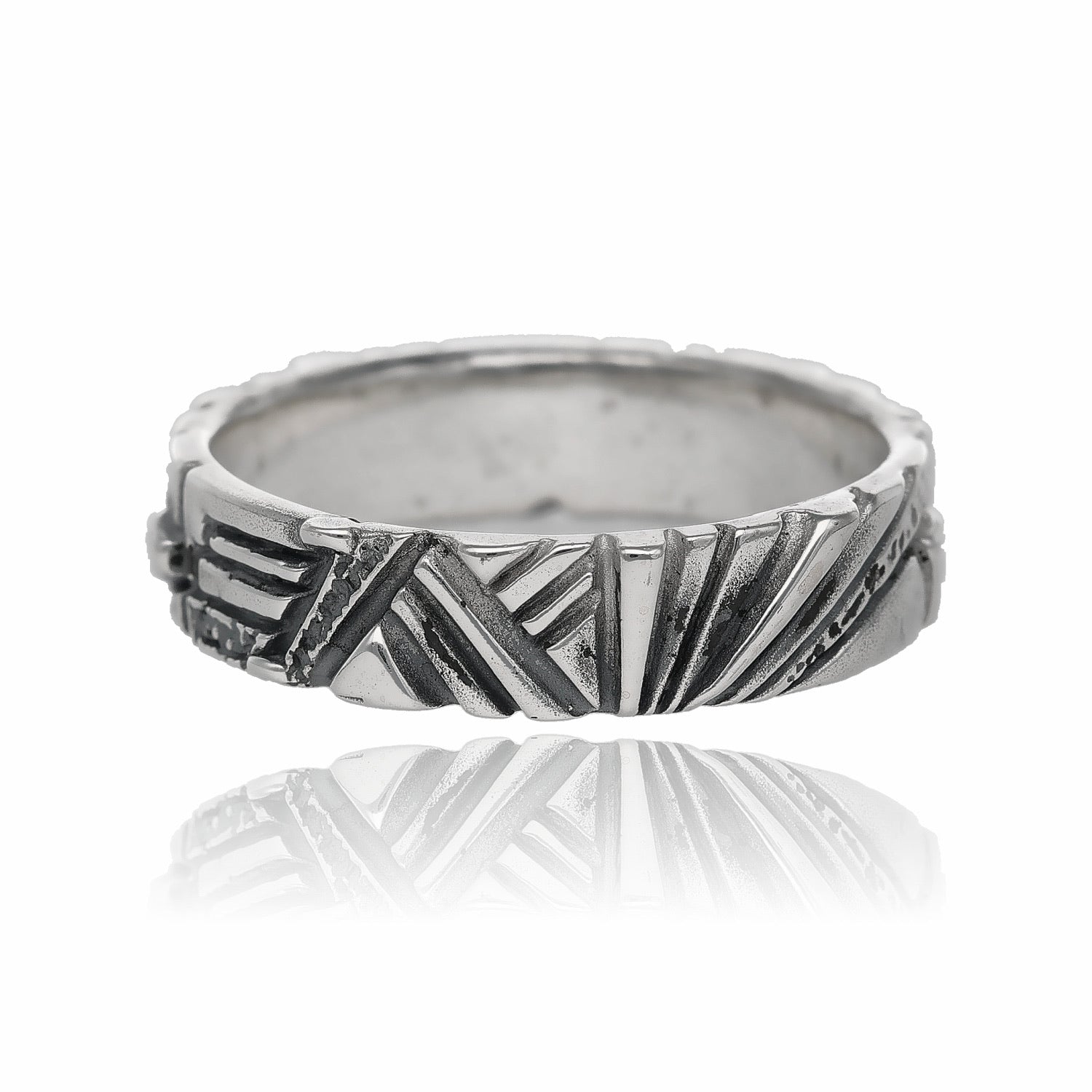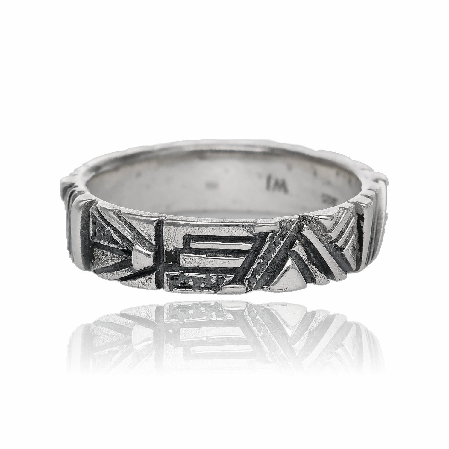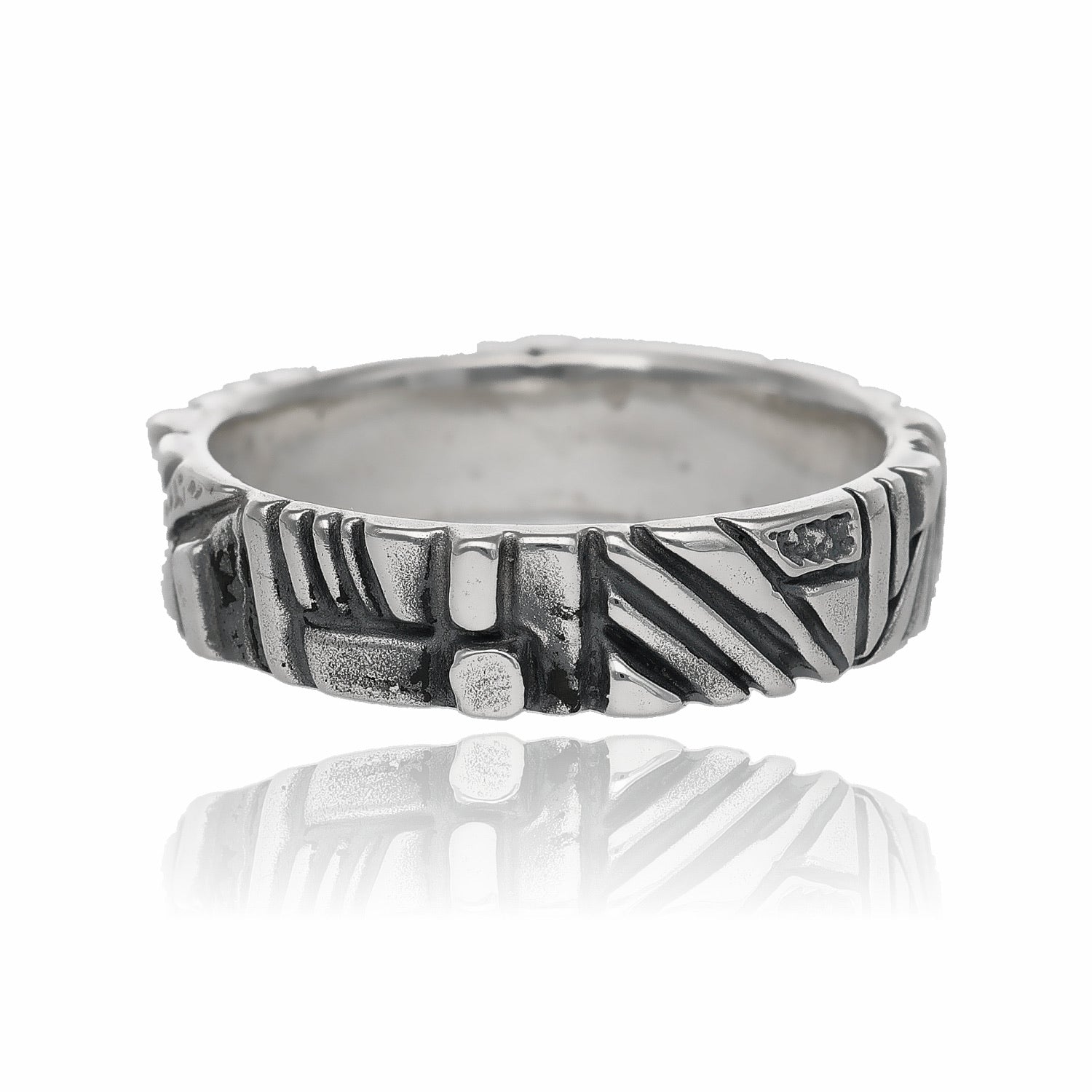 The detail goes all the way around this 6mm wide band, antiqued to show off the planes and recesses. Durable and comfortable for any finger size. Cast in sterling silver.