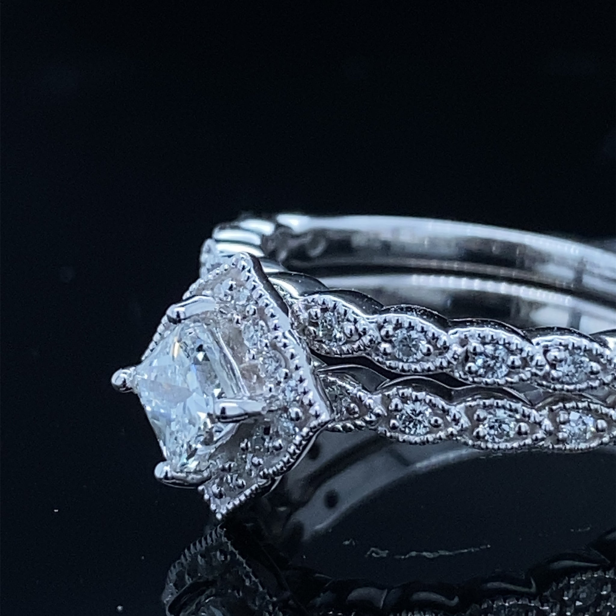 This princess cut diamond halo engagement ring and engagement band is a timeless piece with an elegant scalloped edge that makes this perfect for any bridal set. The center stone is set in a classic 14k white gold halo design and surrounded by two pieces of milgrain detailing. There are 2 diamond bands that complete the look with a scalloped edge that matches the engagement ring perfectly. This ring has a total of .86ct diamond weight and .55 carat VS/F GIA natural princess cut diamond center stone. This is an ideal choice for your wedding or next anniversary.