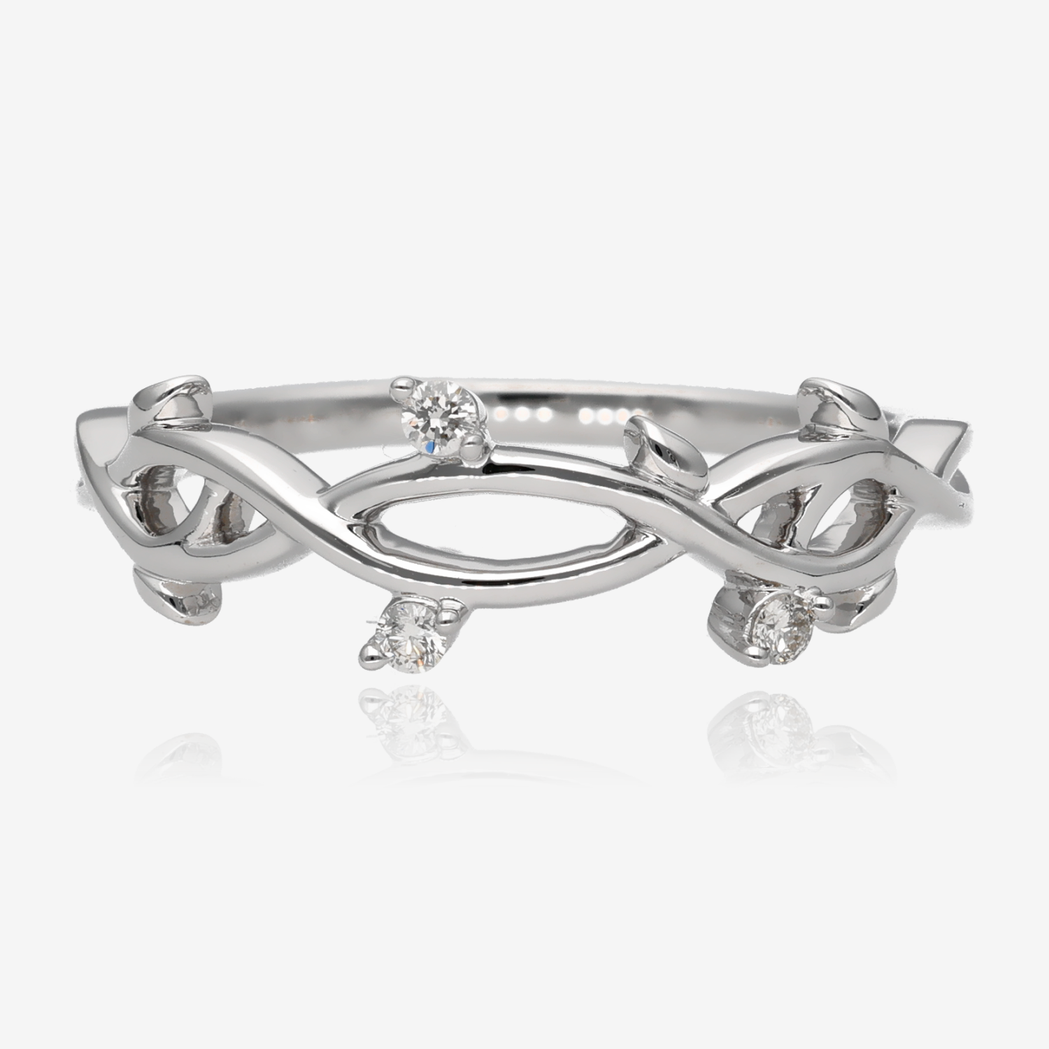 Nature Inspired viny band of gold, with delicate diamonds tucked into the leaves.