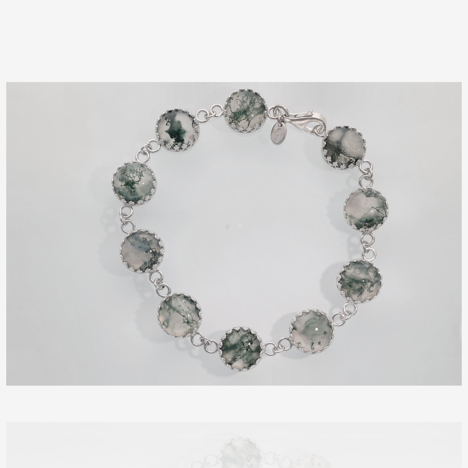 Add a touch of sophistication to your jewelry collection with our exquisite "Green Moss Agate Marrakesh Argentium Silver Bracelet". This handcrafted bracelet features eleven 10mm round green Moss Agate gemstones set in a beautifully designed crown-shaped bezel, creating a perfect blend of elegance and style.