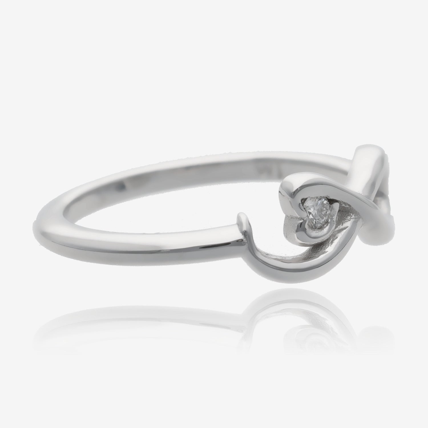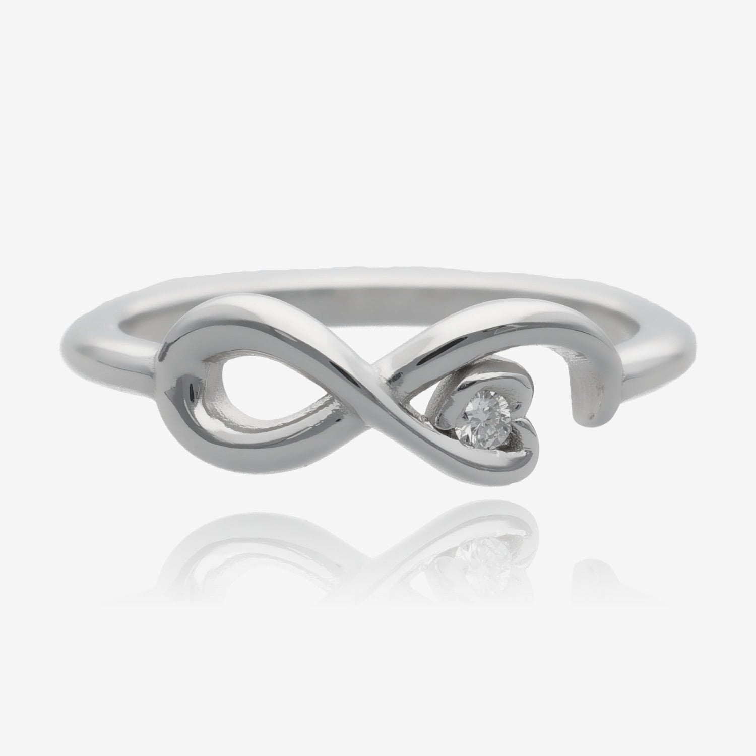 Forever shining- A playful take on the infinity symbol hugs a diamond in one curl. Sterling silver ring set with a 0.04ct natural round diamond.