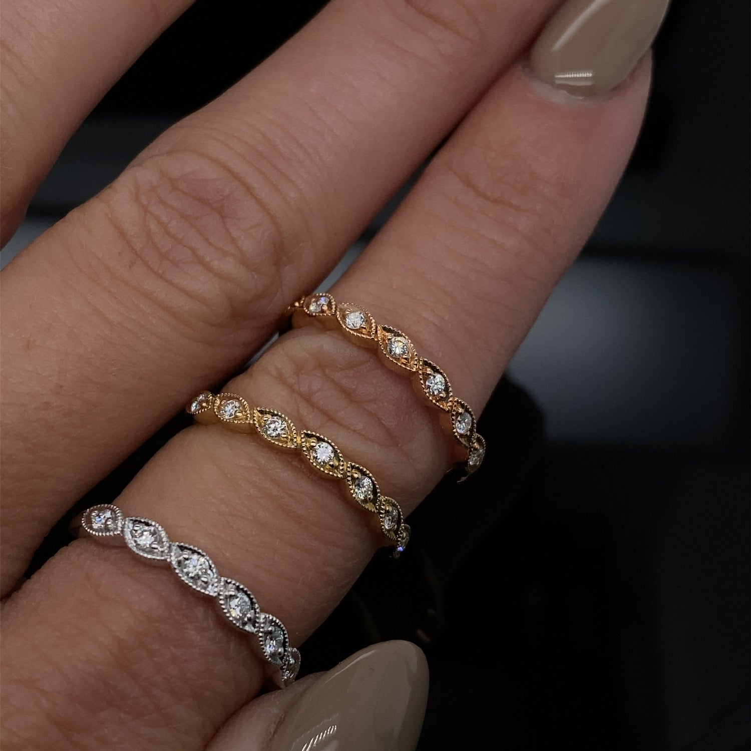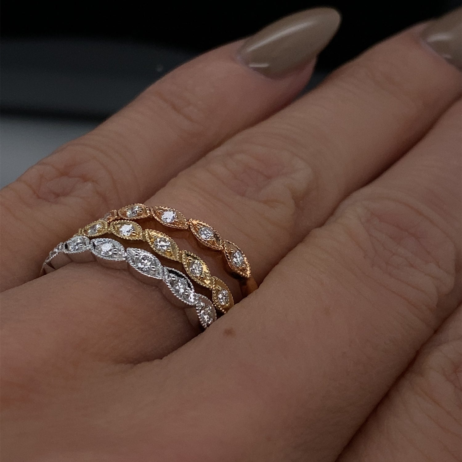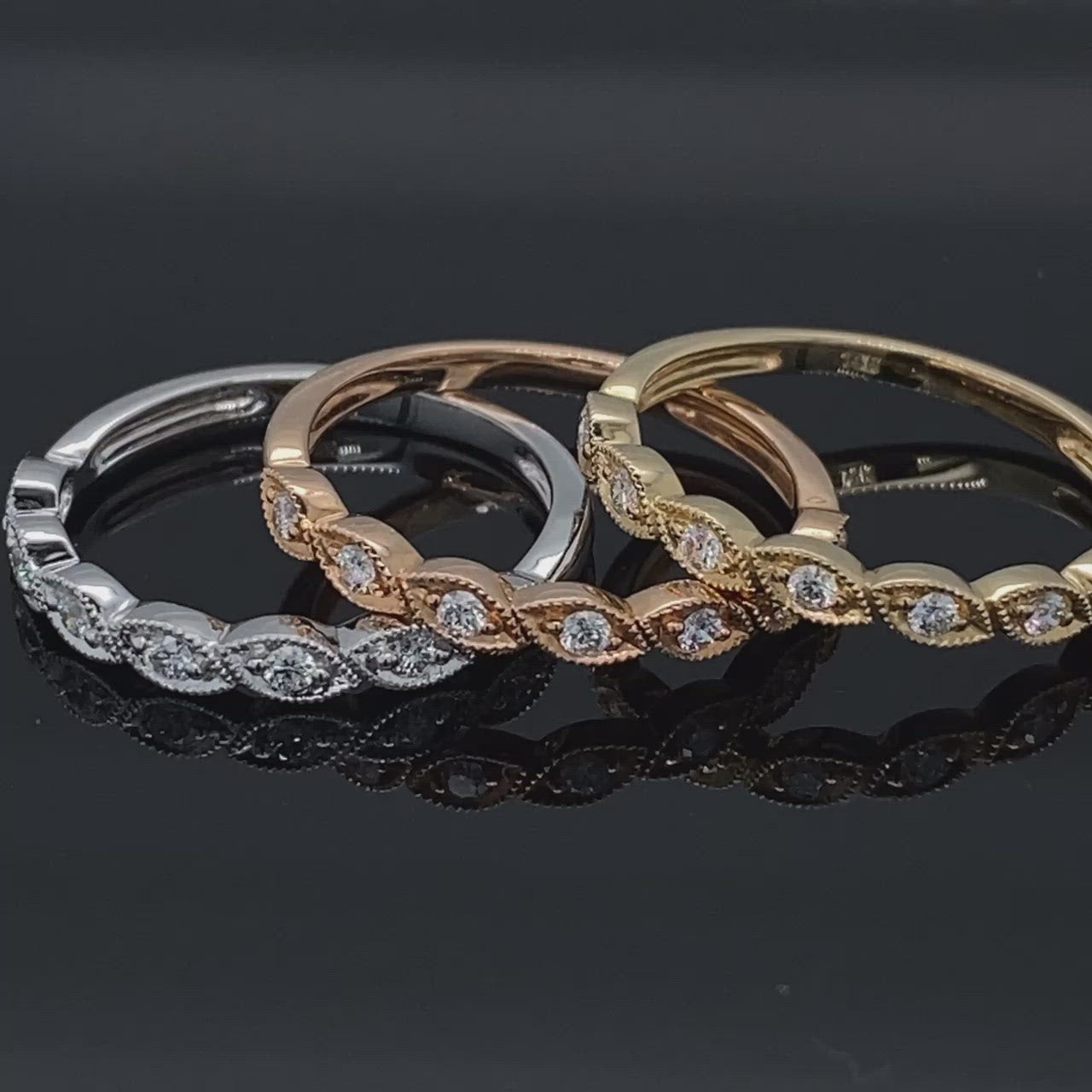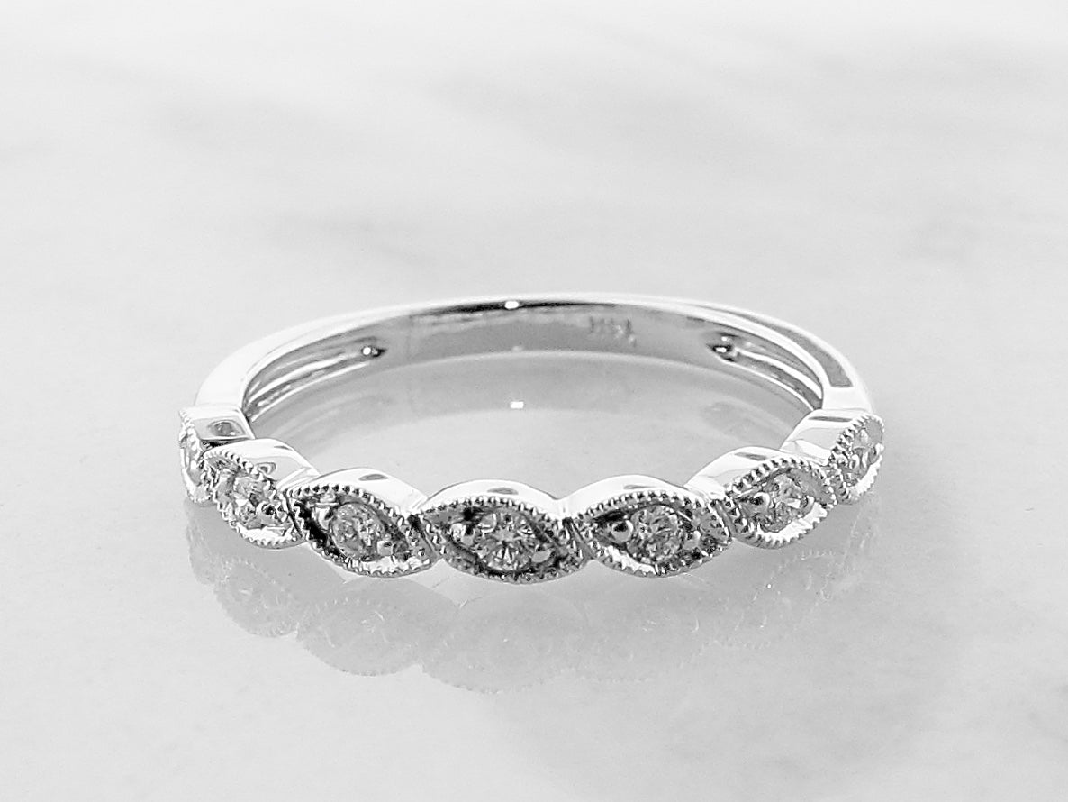Lovely little leaf shapes delicately textured with milgrain surround each brilliant round diamond. Stacks well with any flat profile ring or band.