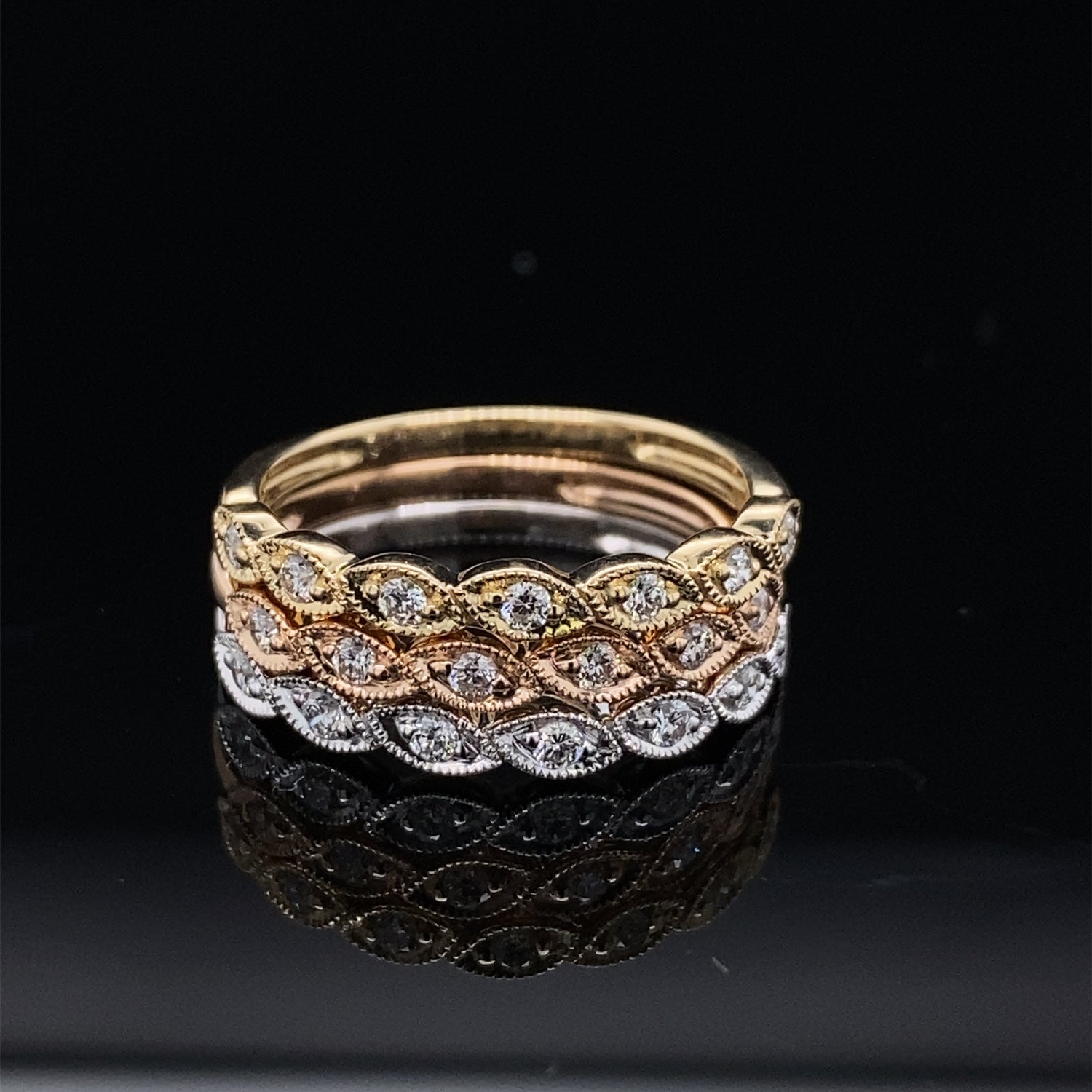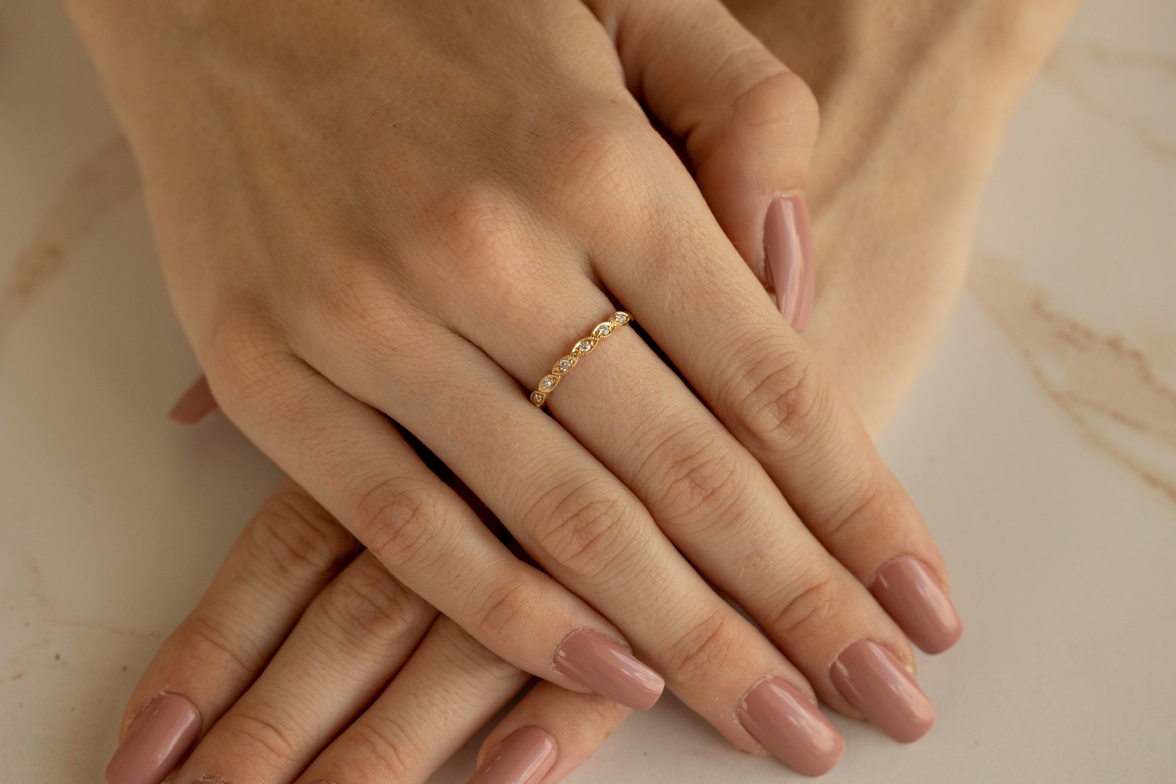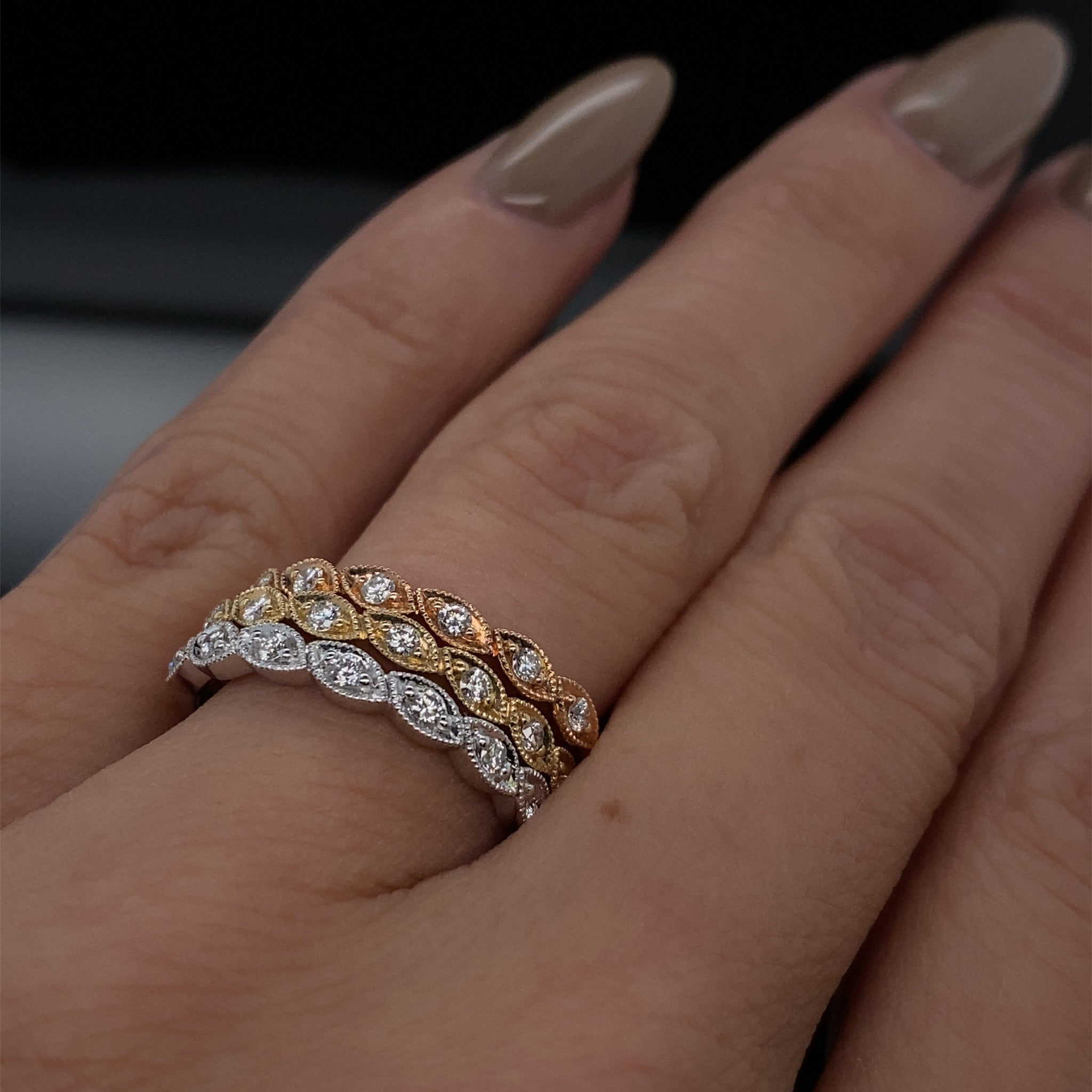 Lovely little leaf shapes delicately textured with milgrain surround each brilliant round diamond. Stacks well with any flat profile ring or band.
