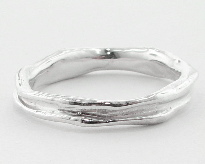 Silver Band, Skinny Melted: molten metal flows and ebbs around your finger in a perfectly unique band. A member of our very well-received melted collection, this lightweight narrow band features higher polished edges and textured recesses. The rolled edges give it the organic melted appearance, as well as making it a comfort fit style as the inside is rounded. The width around this ring varies from 2.5 to 4mm. This item can be used as a wedding band, thumb ring, mother's ring when customized with the addition of stones, etc. The versatility is awesome, and if you like this style check out our medium and wide renditions as well! This band weighs a total of 3.75 grams, .925 Sterling.