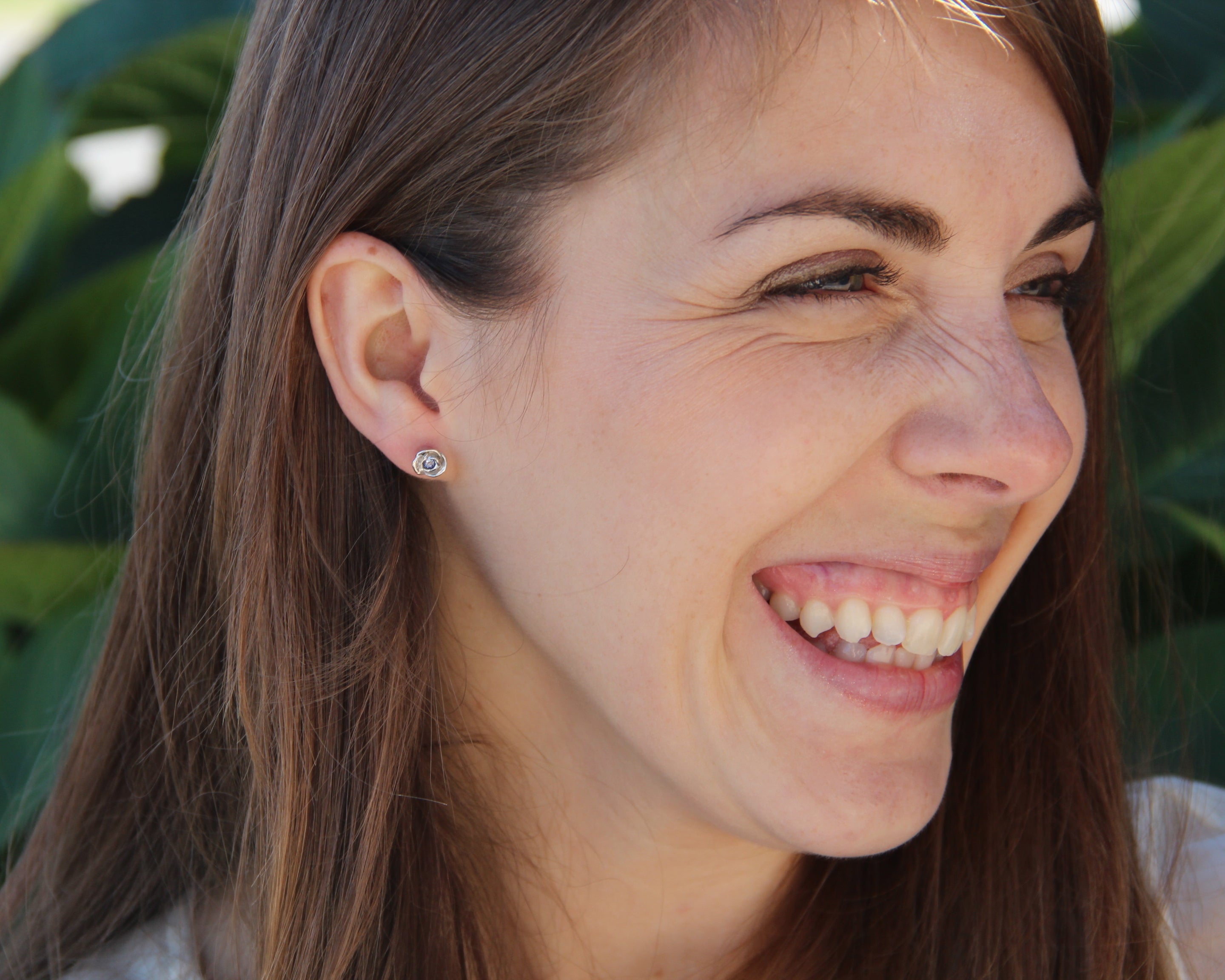 Sweet and small, these little rose studs are appx 7mm around, and stand up from the ear by about 5mm. They are set with a small round aquamarine in each rose, tucked down low into the petals. Stone measures 3mm. Assembled with a simple silver post and nut assembly. 3mm round aqua set in 6mm rose buds