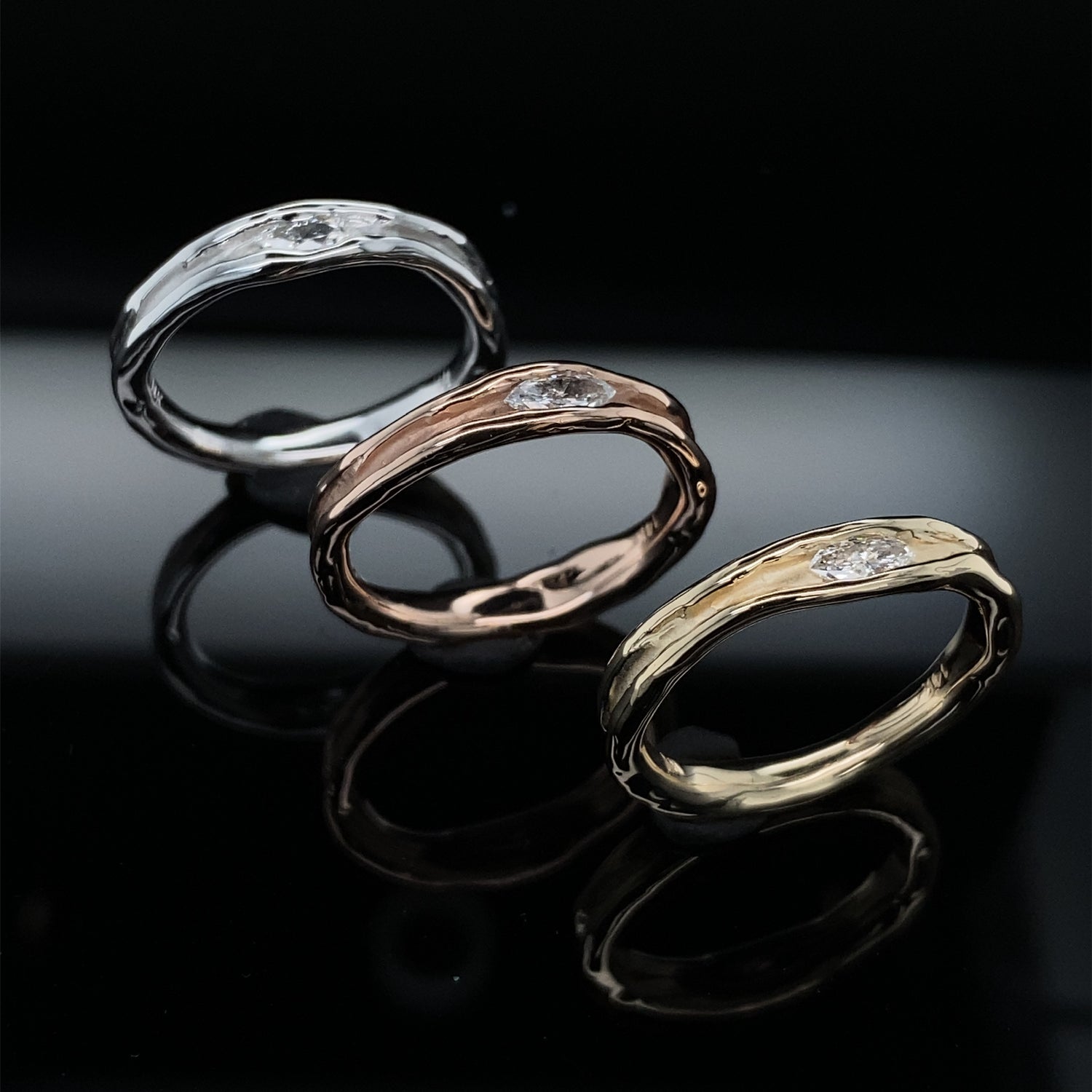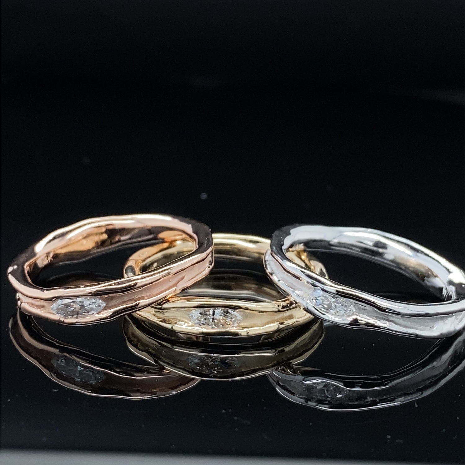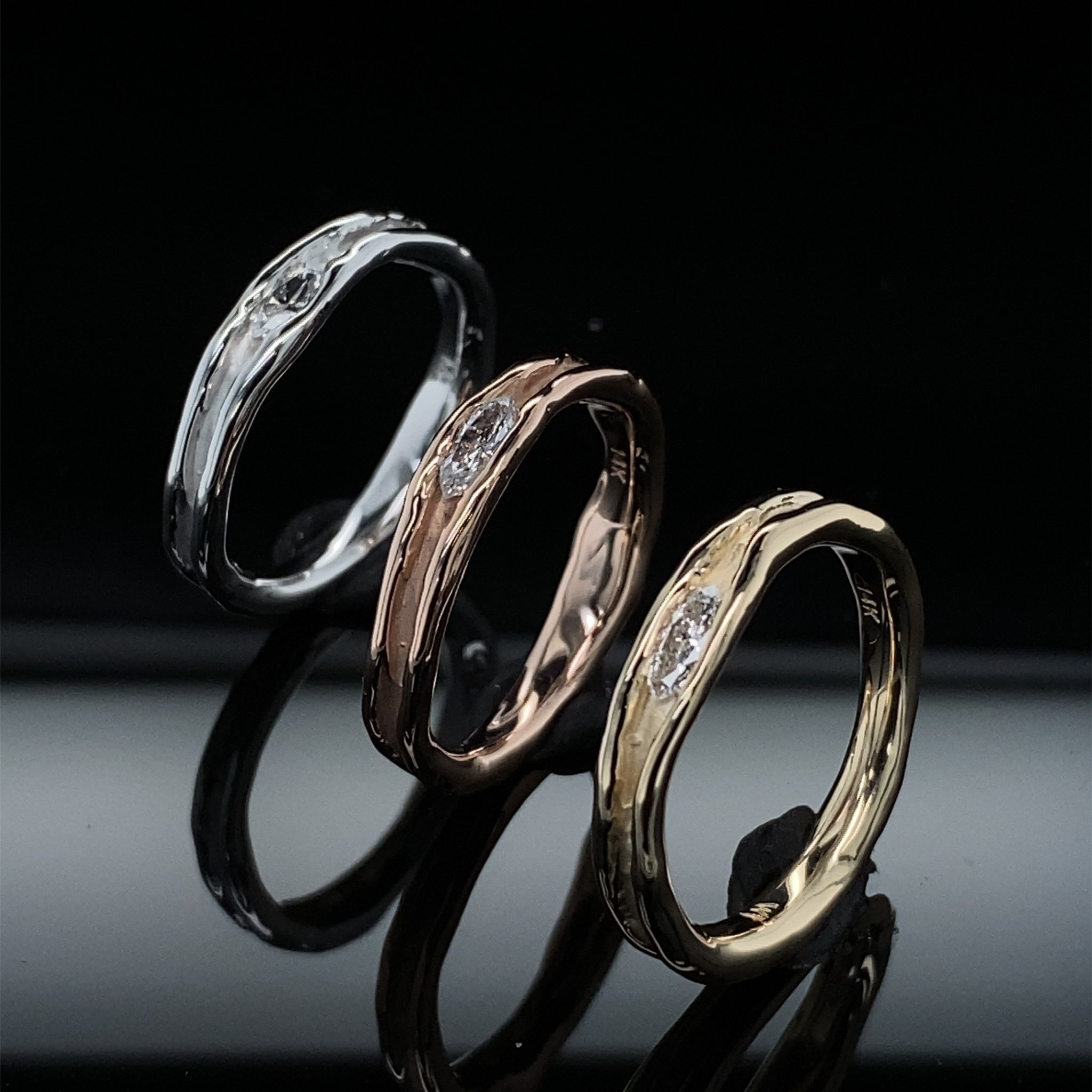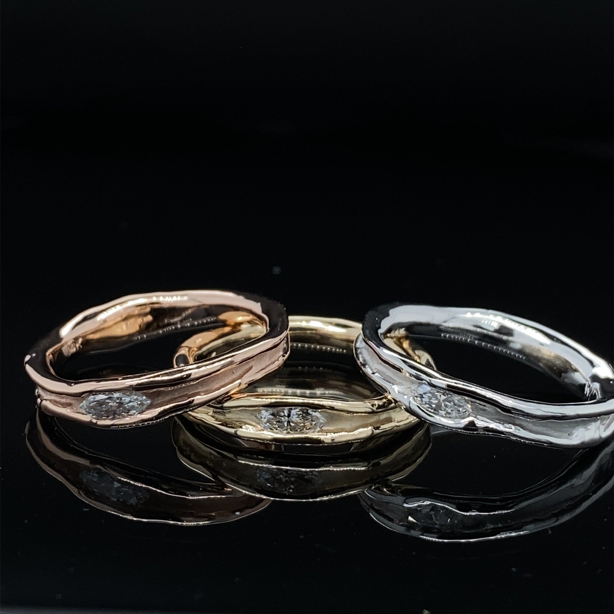 Gold .15ct Diamond Ring, Melted Band - is handmade with rich 14K gold and mounted inside is a 0.15ct marquise cut diamond to make a very unique and perfect engagement/wedding ring. It also can be a superb right hand ring that can be combined with other stacking rings. This is our standard popular Melted band. The diamond is securely held in the setting low to the finger. The band measures approximately 3-4mm all around, undulating in width, thickness and height as it wanders around the finger. If you care to use this as an engagement ring, a second band can be ordered for a wedding band later on, in any metal. The stones are firmly held in by bezels made out of the melted walls of the ring's design.