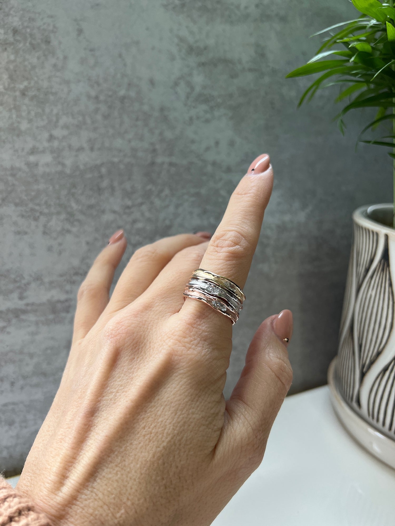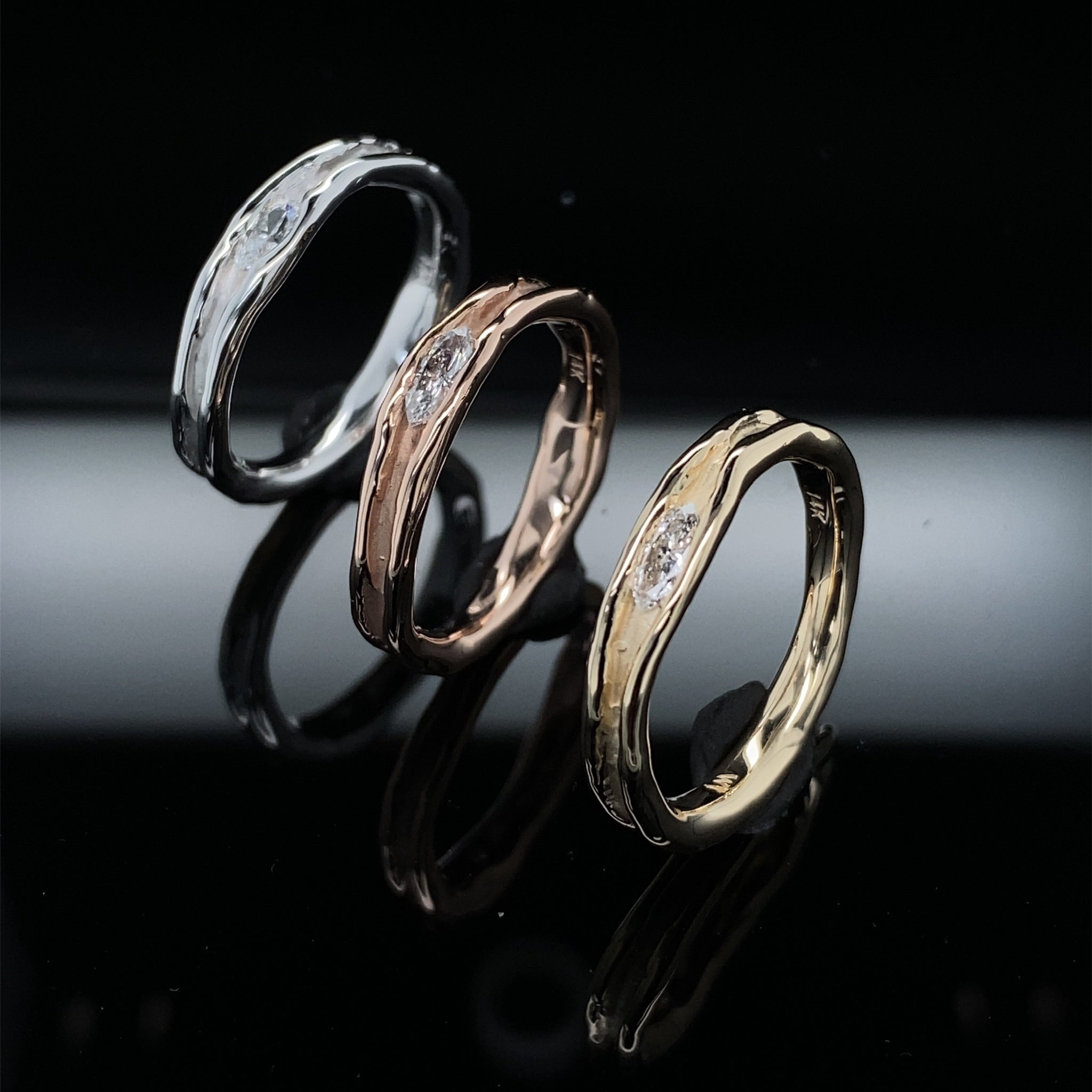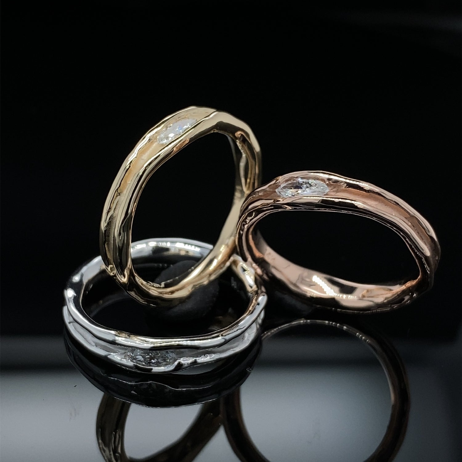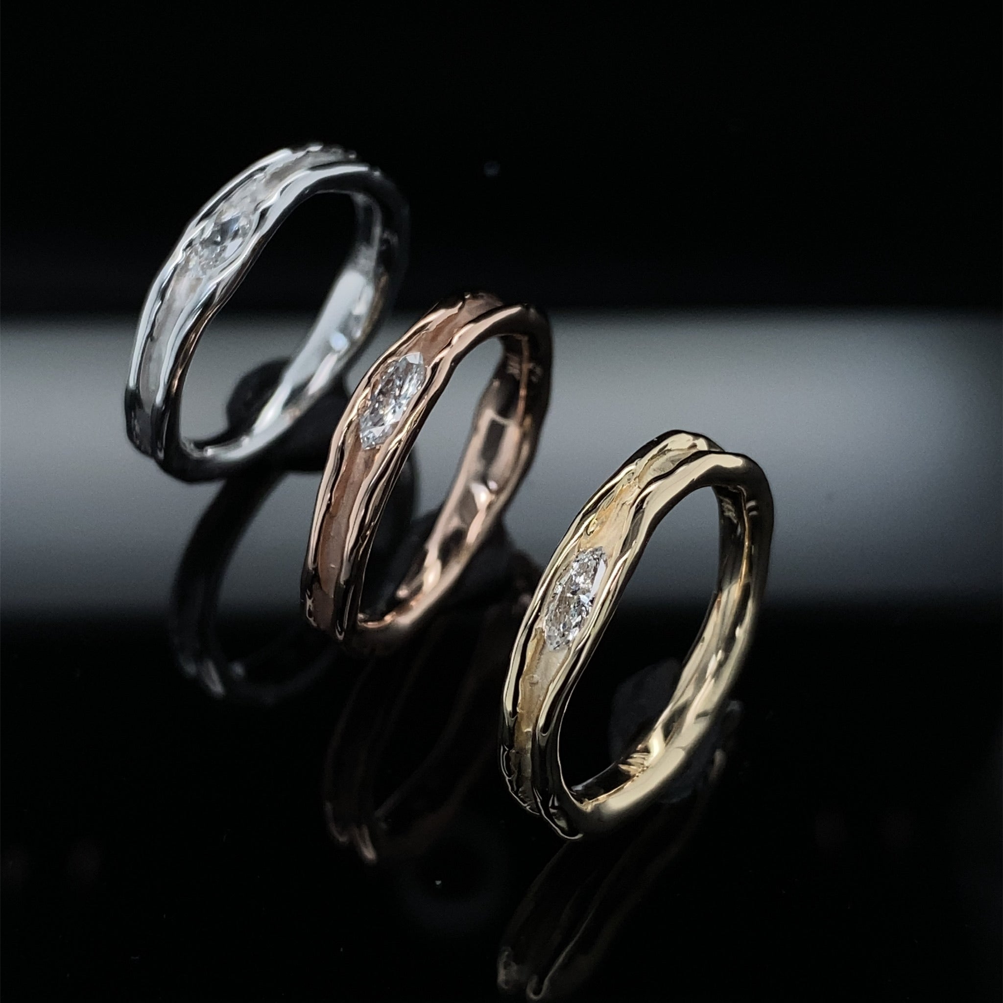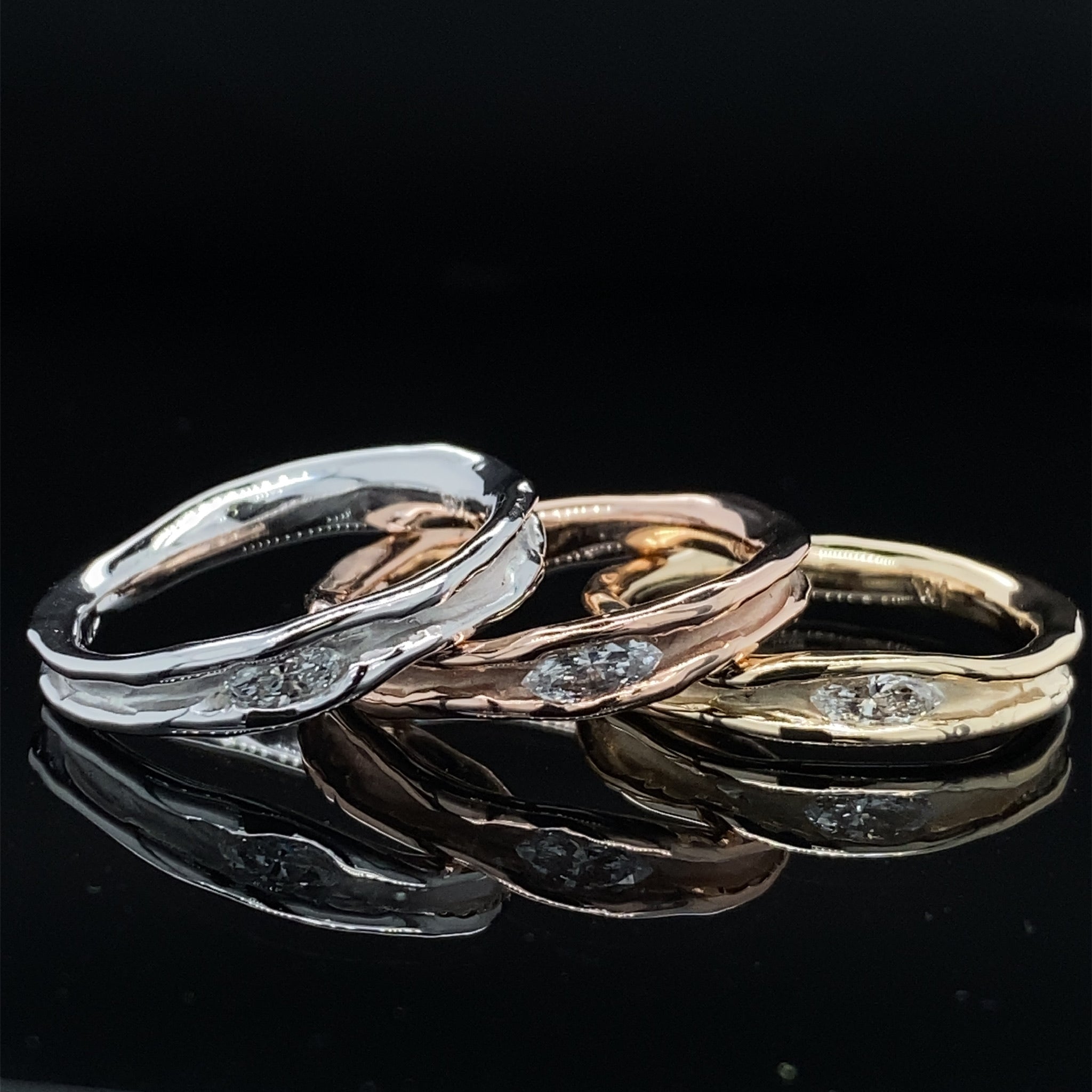 Gold .15ct Diamond Ring, Melted Band - is handmade with rich 14K gold and mounted inside is a 0.15ct marquise cut diamond to make a very unique and perfect engagement/wedding ring. It also can be a superb right hand ring that can be combined with other stacking rings. This is our standard popular Melted band. The diamond is securely held in the setting low to the finger. The band measures approximately 3-4mm all around, undulating in width, thickness and height as it wanders around the finger. If you care to use this as an engagement ring, a second band can be ordered for a wedding band later on, in any metal. The stones are firmly held in by bezels made out of the melted walls of the ring's design.