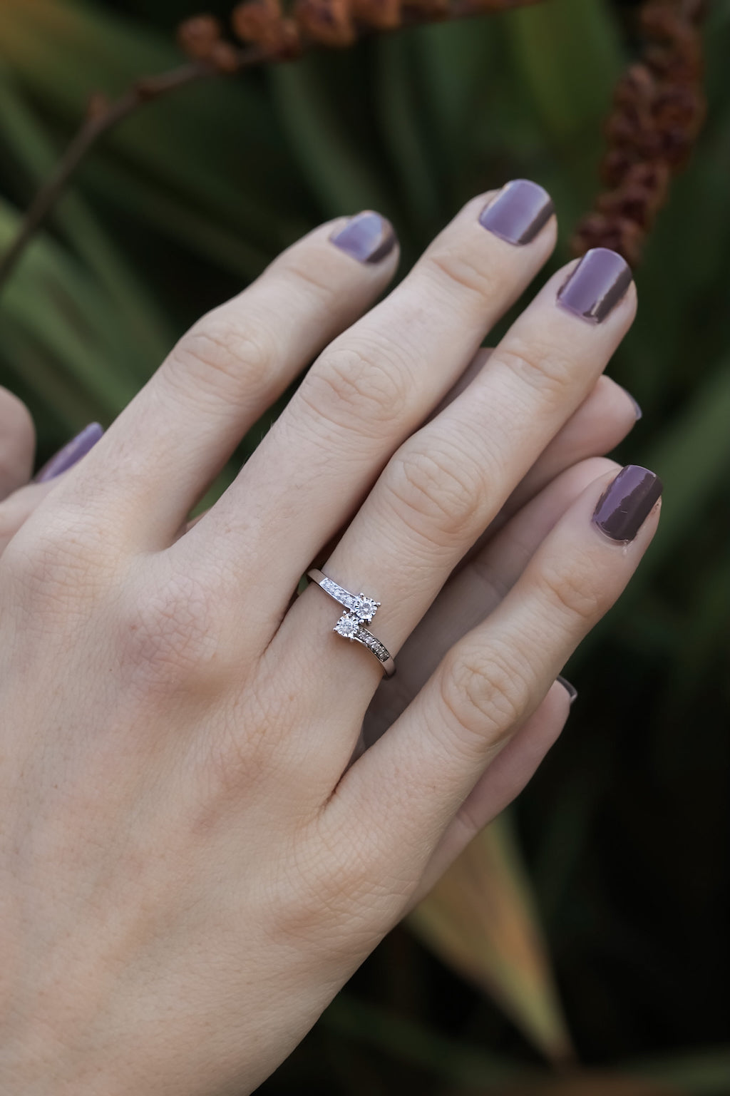 Presenting the "Always by Your Side Diamond Promise Ring" - a sterling silver two-stone round diamond overlapping ring with a total weight of 0.11 carats. Symbolize your enduring love and commitment with this elegant and timeless piece. Perfect for everyday wear or special occasions, it's a meaningful gift that will be treasured forever. Order yours today and express your unwavering devotion.